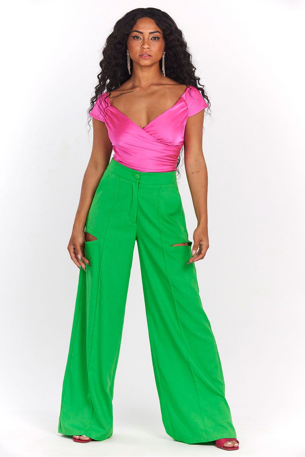 O recorte com abertura nas laterais dá um toque de modernidade e personalidade. . O caimento leve da calça permite que ela seja usada em diversas ocasiões, desde looks casuais até looks mais formais.